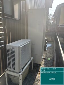 既存機器を撤去後、架台はそのまま再利用して新しいエコキュートを設置。配管接続・試運転まで行い入替工事を実施しました。工事は半日ほどで完了しています。なお、今回は10年保証にもご加入いただきました。