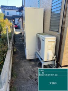現地確認の結果、経年劣化が進んでいたため、東芝製エコキュートから三菱製エコキュートへの交換をご提案しました。